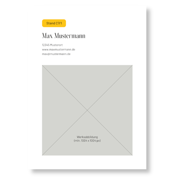 Da der Messekatalog 1 Monat vor der Vernissage in Auftrag gegeben wird, kann dieses Angebot nur vor diesem Zeitraum wahrgenommen werden. Die Druckvorlage wird von ARTe Kunstmessen nach Vorgaben und Text- und Bildmaterial des Ausstellers erstellt und nach Freigabe in den Katalog eingebunden. Die Inhalte sind frei und formatfrei, können also einzelne Werke oder Hinweise auf andere oder künftige Ausstellungen beinhalten. ARTe Kunstmessen behält sich vor Inhalte abzulehnen.
