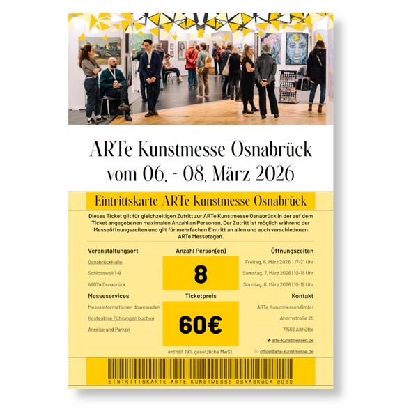 Hier im ARTe Store erhalten Sie Ihren digitalen 3-Tages-Pass für die ARTe Kunstmesse Osnabrück 2026 zum ermäßigten Preis von 12 Euro pro Person. Die Eintrittskarte einmal digital auf Ihr mobiles Endgerät laden und drei Tage unbeschwert allein oder mit Ihrer Familie oder Freunden die ARTe Kunstmesse Osnabrück vom 6.-8. März 2026 in der OsnabrückHalle im Herzen von Osnabrück besuchen.